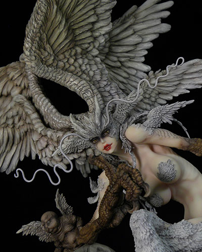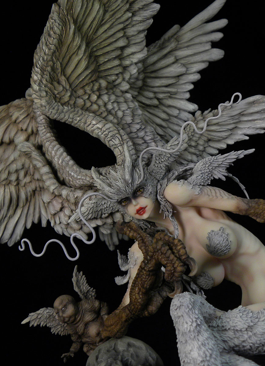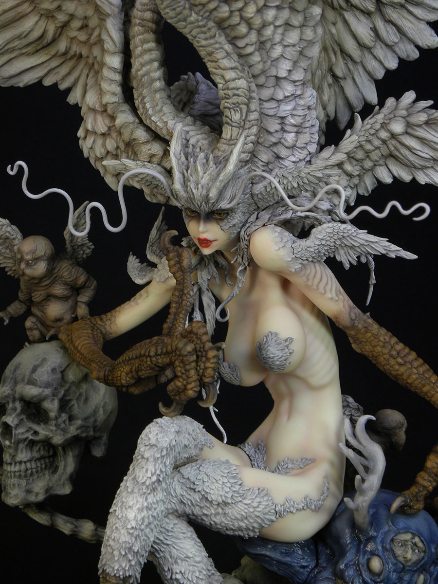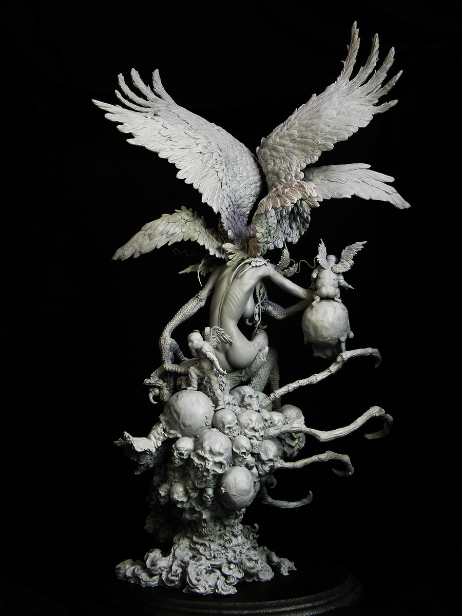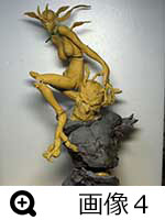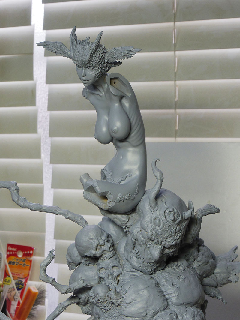 翼の部分は色々アドバイスを聞き、シレーヌといえば翼が本体ほど大きくないといけないと決めて、アルミ線で形を出してガムテープを貼ってそこにまたエポキシパテを貼って・・という順にイメージを整えていきます。顔は丸々作り直してたかな?足を切って変えてますが、アドバイスを聞いて後々元に戻す形になっていきます。下の部分の千切れたデーモンは丸っきり作り直してますね。そもそもイラストを見てシレーヌ以外の部分をどう作るか、ボリュームはどう変えるか(できるだけ小さくすべきと考えていました)少し悩みました。