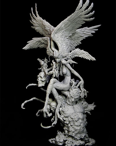 シレーヌを出来るだけ地面から離してできるだけ高い所に留まっているように見せたいと考えてから、ボリュームを決め、千切れたデーモンから髑髏が溢れ出しているイメージで作ると決まると全体の構成が見えてきました。画像2