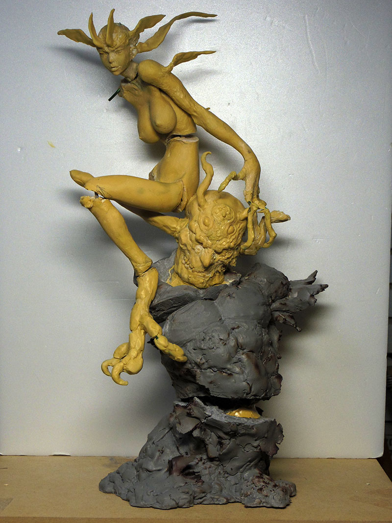 千切れたデーモンをまた一ヶ所ズバッと切って角度を調整しています。身体はほぼ決まってきてますね。顔・胴・腕脚の構成、厚みや長さが大体こんな感じで良いかなと。決まった時点で周辺に配置しなきゃいけないものとか無い方が良いかなというモノを選別していってます。ここまでが早くできる人は上手い人だと思います。